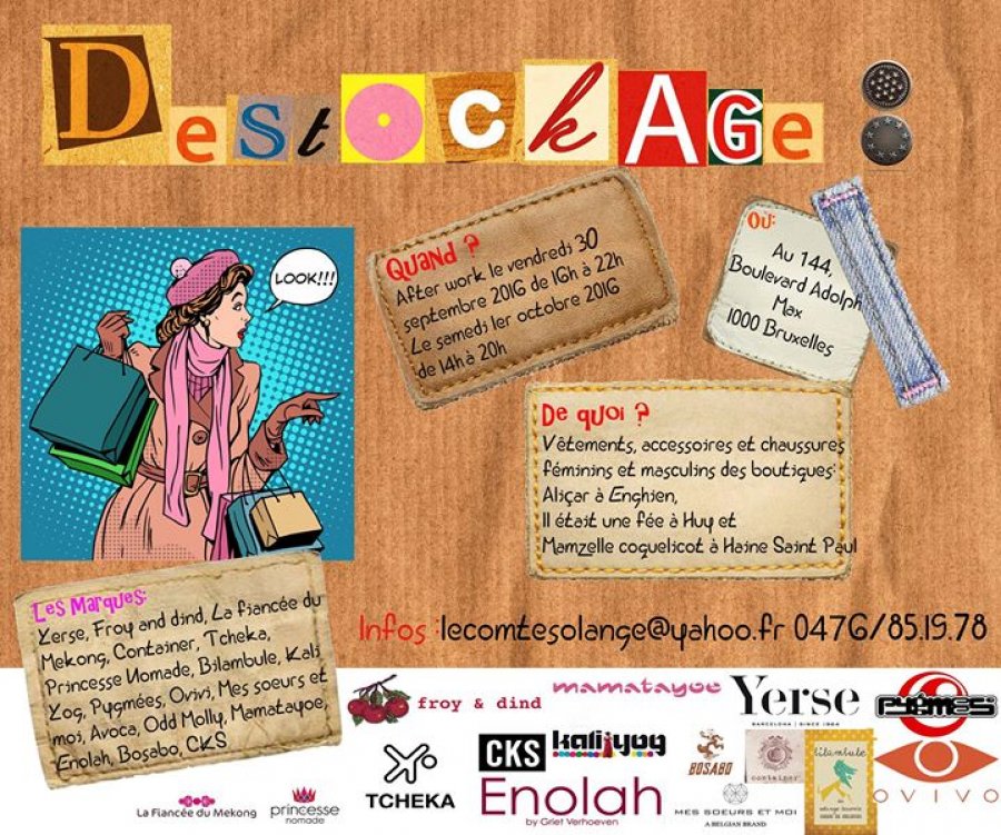 A partager sans modération... Un rendez vous que je vous propose à ne pas manquer... Pour ceux et celles qui aiment la mode bio éthique... J'ai décidé d'aider 3 petites boutiques à déstocker leurs invendus (une vraie petite mine d'or)... J'organise donc un grand déstockage de vêtements femmes et hommes, chaussures et accessoires en plein cœur de Bruxelles le vendredi 30 septembre et le samedi 1er octobre ... Une grande partie exposée seront des marques responsables à petit prix (déstock...): Yerse, Froy and dind, La fiancée du Mekong, Container, Tcheka, Princesse Nomade, Bilambule, Kali Yog, Pygmées, Ovivi, Mes soeurs et moi, Avoca, Odd Molly, Mamatayoe, Enolah, Bosabo, CKS, Envie de flâner et de partager un super bon moment ensemble ? Où: 144, Boulevard Adolph Max 1000 Bruxelles Quand: Le vendredi 30 septembre (de 16h à 22h after work avec un petit verre offert) et le samedi 1er octobre (de 14h à 20h avec un petit goûter bio éthique).. Infos: lecomtesolange@yahoo.fr ou 0476/85.19.78