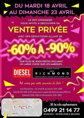 Le RDV EPHEMERE vous invite a sa vente privée qui aura lieu du mardi 18 Avril au dimanche 23 Avril inclus.