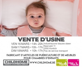 Childhome, fabricant d’articles de puériculture et de meubles pour chambres bébé & junior ouvrira ses portes au grand public. Lors de ces journées de vente, vous trouverez des fins de séries: du mobilier pour la chambre, du petit mobilier, des poussettes, du linge de lit /parcs à des prix très attractifs.