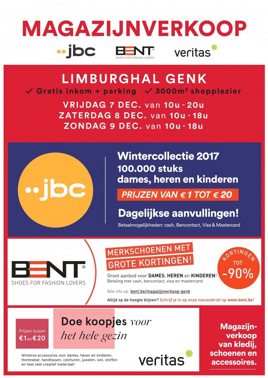 Super aubaines pour toute la famille ! Les 7, 8 et 9 décembre, nous vous invitons aux ventes d'entrepôt de JBC, Bent et Veritas dans le Limburghal à Genk. Plus de 100.000 pièces de la collection automne-hiver JBC 2017 pour filles, garçons, bébés, dames et messieurs avec des prix de €1 à €20. Chez BENT des remises exceptionnelles allant jusqu'à -90% sur les chaussures pour femmes, hommes et enfants. Complétez votre tenue avec des sacs à main cool et d'autres accessoires amusants à des prix compétitifs chez Veritas. Informations pratiques Moyens de paiement Encaisse Bancontact Visa/Mastercard Bon à savoir Entrée libre et parking spacieux Suppléments quotidiens chez JBC Les points JBC ne peuvent pas être sauvegardés/argentés Salles d'essayage disponibles par département (seulement chez JBC) Les retours ne sont malheureusement pas possibles. Joli coin des enfants